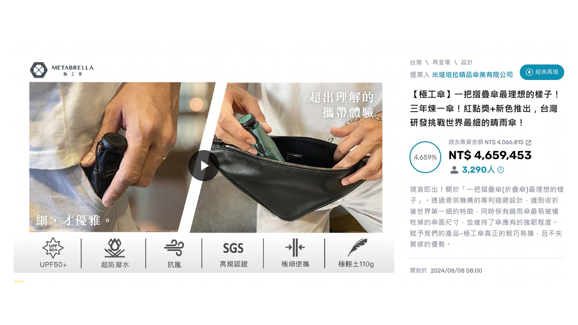 值得一提的是,Metabrella在推廣過程中運用商業影片製作與訪談紀錄片,透過影片製作加持,讓募資出奇成功。高質感影片不僅完整呈現品牌理念,也成功打動支持者,成為品牌跨足國際的重要助力。